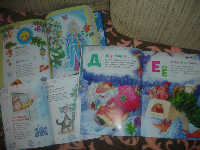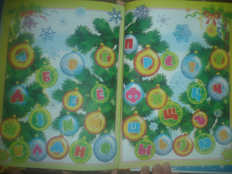 «Новогоднюю азбуку» Степанова я показывала, а вот про вторую даже забыла. Сама не покупала, подарили когда-то. Саня нашёл её в общей куче. Картинки слишком «нарядные»: снежинки-ёлочки-шары-гирлянды, всё в кучу, иллюстрации компьютерные. Стихи средненькие, есть ничего, есть посредственные. Но как же Сане нравится сама идея азбуки! Особый шик в его глазах книге придаёт ёлочка в конце. И снегири у нас теперь исключительно «розовые шарики».