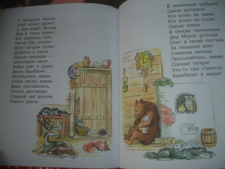 Сборник с иллюстрациями Сутеева. Больше всего сын просил «Ёлку» (которая ещё иногда «Снеговик-почтовик» называется). Чудесная история. На втором месте по читаемости - «Весёлый Новый год». Названия Саня игнорирует и говорит кратко: «Про мышей». По реакции сына я поняла, что мыши в принципе могли заниматься чем угодно, лишь бы не забывали вовремя прыгдаскокать и хоплялякать. А вот иллюстрации вызвали живой отклик: «Мама, а почему этот мышонок плачет? Мама, а этот почему не спит?». У меня схожие эмоции - Сутеев здесь гениален и делает обычный стих шедевром. Не могу сказать, что стих стал хитом, почитали и почитали, без безумств. Остальные тоже читали - «Ёлка» Михалкова понравилась меньше всего - и мне, и сыну. На фоне «Как аист на ёлку опоздал» и «Заяц и рак» этот стих немного «ниочём»: мальчик пошёл за ёлкой, мальчик принёс ёлку.