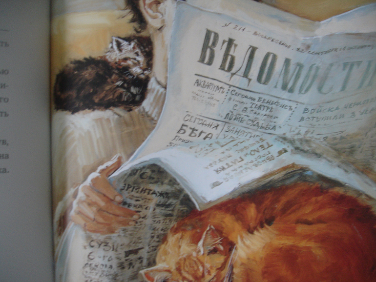 «Ёлка, кот и Новый год». Как я уже говорила, взяла книгу даже не вчитываясь, так я хотела себе эти иллюстрации. О вторичности текста свидетельствует уже тот факт, что впереди нигде нет имени автора. Только «художник Мария Павлова». Я уж было подумала, что она и есть автор текста. Ан нет, в конце, где все выходные данные книги,подписано: текст К.Мартынова, О.Василиади. Тираж, кстати, солидный - 12 000. В одной из рецензий к «Воробей и фокусник» в «Лабе» я читала, что М.Павлова просто рисовала картины, а к ним потом написали текст. В принципе, похоже на правду. Тем более что Хозяин котов в предновогоднюю пору читает газету, на которой мелькает 22 сентября и какое-то там октября.
