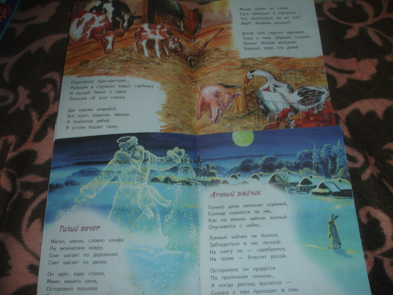 «Зимушка-зима» и «Белая сказка». Серия «Времена года» от "Адонис" мне нравится. Тот вариант, когда можно ненавязчиво почитать про природу. Люди, как по мне, страшноваты, но пейзажи и звери очень даже. Подборка стихов тоже приятная. Конкретно о зимних. Степанов, которого так-то я не особо люблю, здесь вполне хорош, но Саша Чёрный просто великолепен! Сане, кстати, «Белая сказка» тоже заметно больше нравится. У Чёрного такие непосредственные стихи, которые, как мне кажется, понятны и близки детям. Любимые у Саньки - «На коньках» («Раз и два», как он его называет) и «Воробей». А «В хлеву» очень умиротворяюще действует на меня.