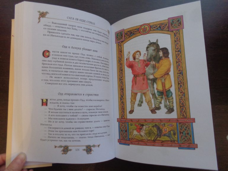 "Наследники Одина" и "Сокровища нибелунгов" купила по скидке (естессно) и только из-за текста. Качество книг отличное, прекрасные белые страницы, а иллюстрации...если бы была возможность выбора, то врядли я остановилась бы на Денисе Гордееве, однако он монополист)))