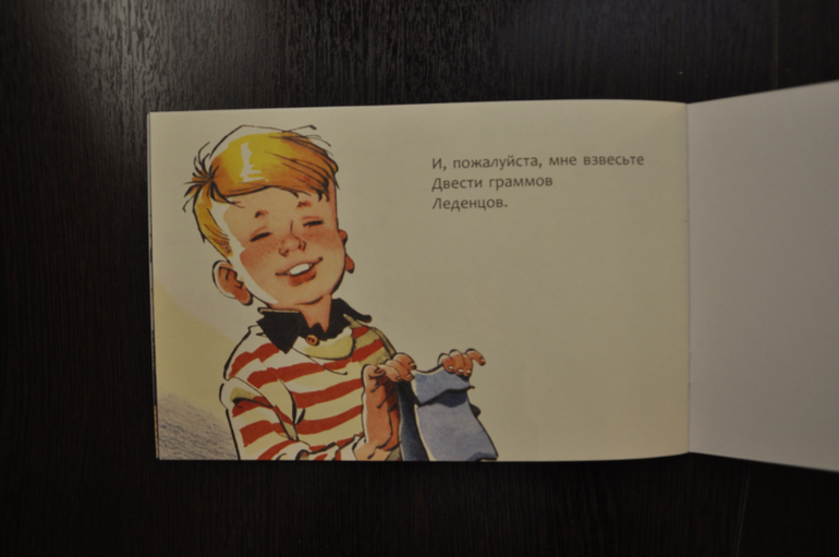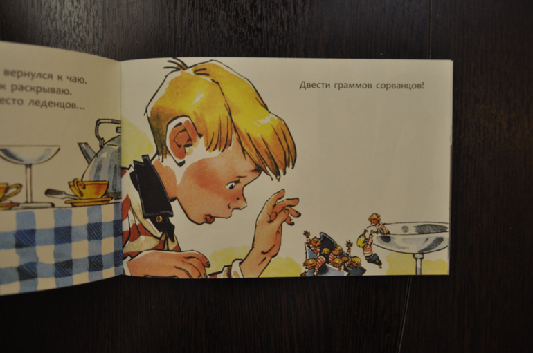 Полюбилась нам эта стильная маленькая книжка. История, конечно, странновата для моего взрослого восприятия. Но у дочери всё в порядке вещей. Вполне себе такая заурядная ситуация: вместо леденцов мальчику в магазине продали горстку маленьких озорных человечков.![]()
