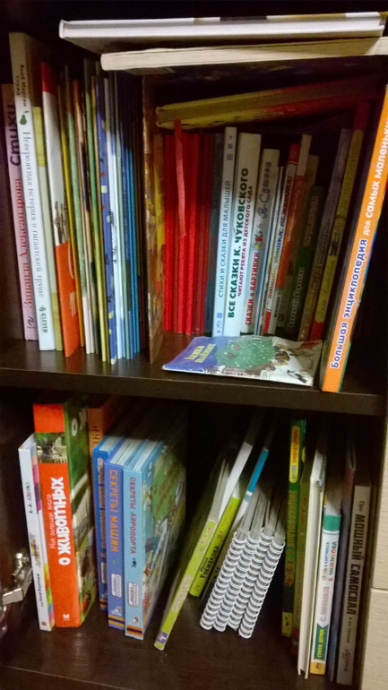 Читаем в основном перед сном, книг не очень много, но наша библиотека местного масштаба периодически (после больших скидок в Лабиринте) пополняется.