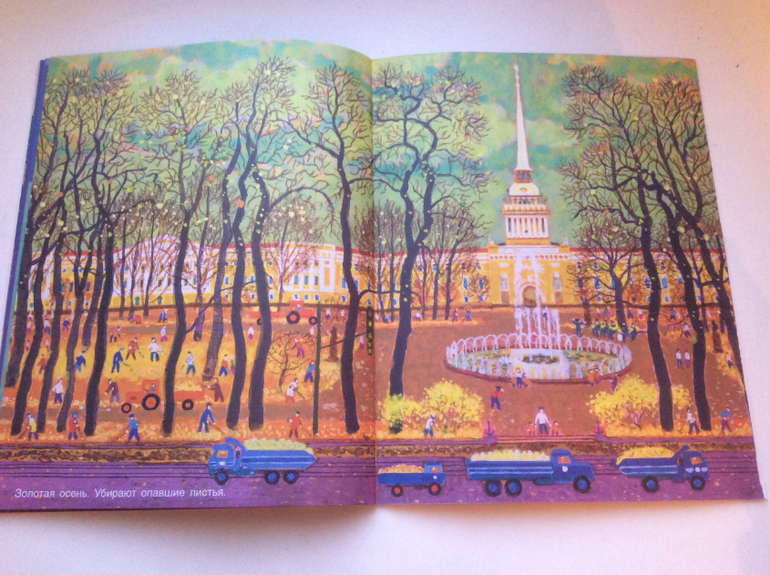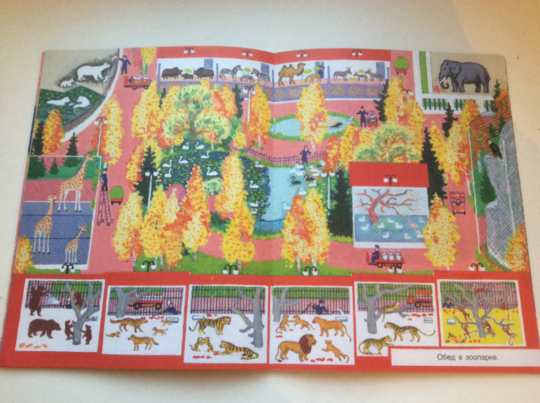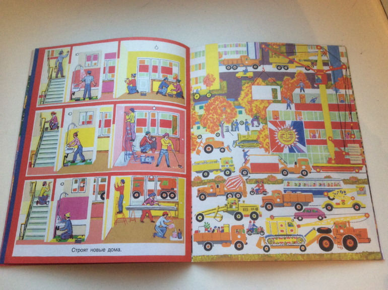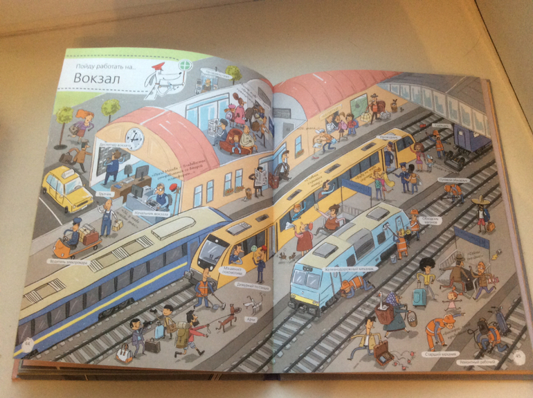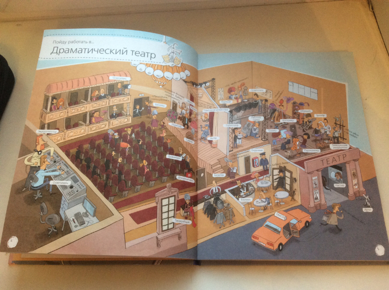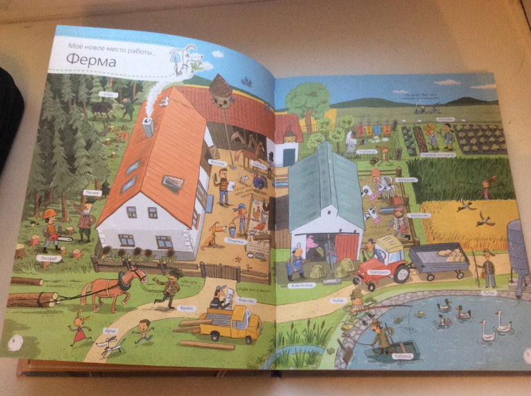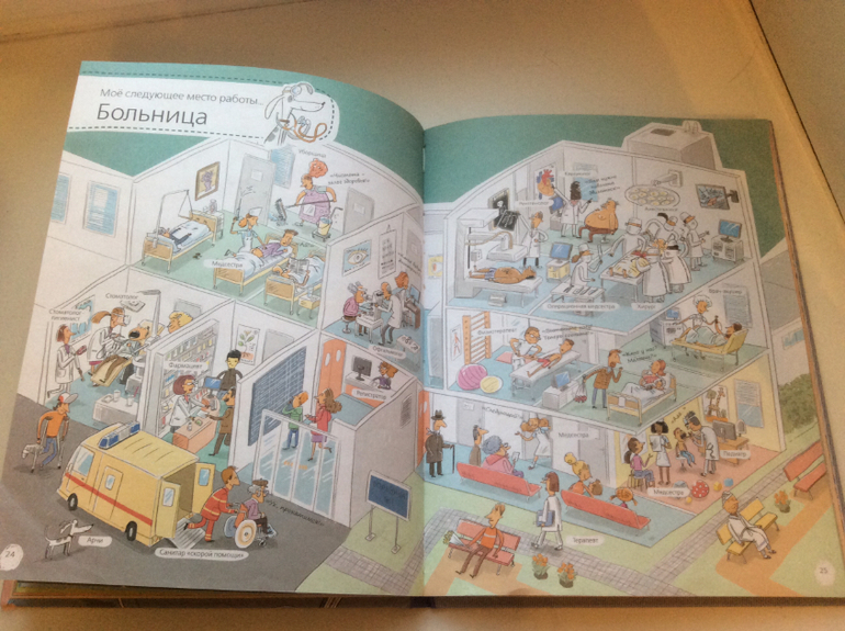В книге по каждому месту идут два разворота. На первом изображена, например, больнице и какие-то сценки из больницы. а на втором развороте идет уже описание основных профессий в этой области.
