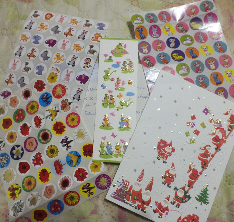 Чудесная открытка,закладка и наклеечки. Яся все себе забрала.Делится не хотела,ели уговорилась.И тут же все употребила в дело-открытки Деду морозу стала делать))