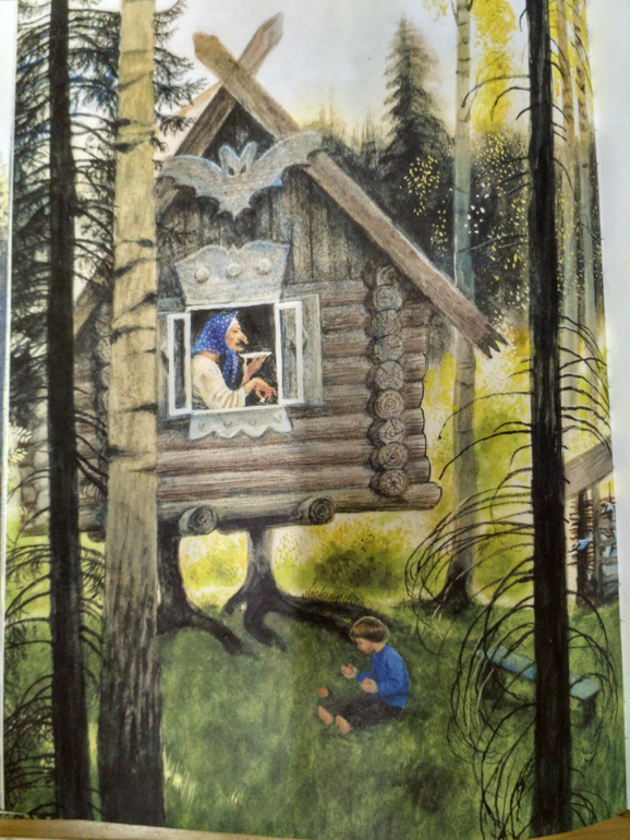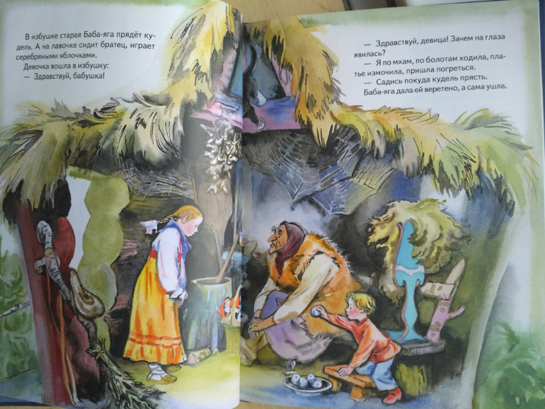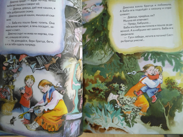 Итак, первая сказка Гуси-лебеди - классический пересказ, здесь и молочная речка с кисельными берегами, и Баба Яга, которая кудель прядет. И мышка есть, которая девочке подсказала и помогла.![]()