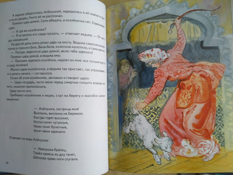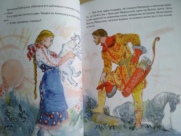 И ещё мне лично резануло слух, что Алёнушке повстречался не купец а царь. У нас в другой книге которою мы и читали с дочкой - купец.