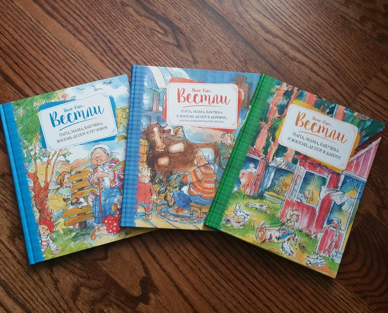 Дн первая " Мама , папа, восемь детей и грузовик" , дальше мы купили "" Знакомьтесь Гюро" и тоже встретили там 8 детей маму , папу и грузовик, потом перешли на "Аврору из корпуса Ц" и " сейчас читаем " Аврору и Сократа" и ещё купили про 8 восемь детей маму и папу в Дании , но ещё не прочлиВсе книги легкие, интересные, веселые и персонажи пересекаются.