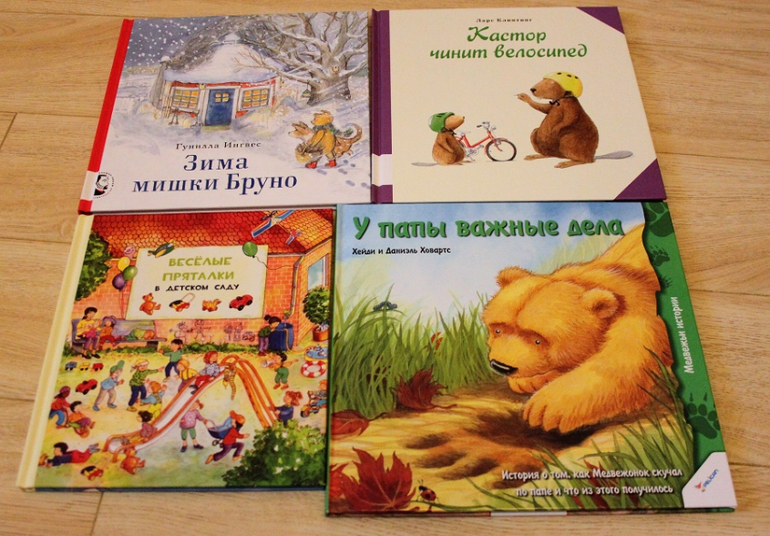 Про эти книги я писала обзоры. "Зима мишки Бруно", "Кастор чинит велосипед", "Весёлые пряталки", "У папы важные дела". Книжки тоненькие, маленькие, хватало на один раз. Пряталки постоянно разглядываем)