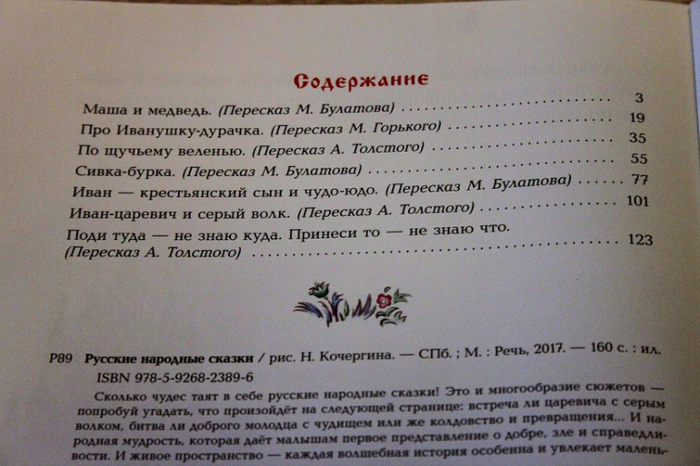 "Русские народные сказки" в иллюстрациях Кочергина. Я писала про неё не так давно. В январе мы прочитали не все сказки, но недавно дочитали её. Очень понравилась, она захватывает всё внимание ребёнка, он часами иллюстрации может рассматривать.