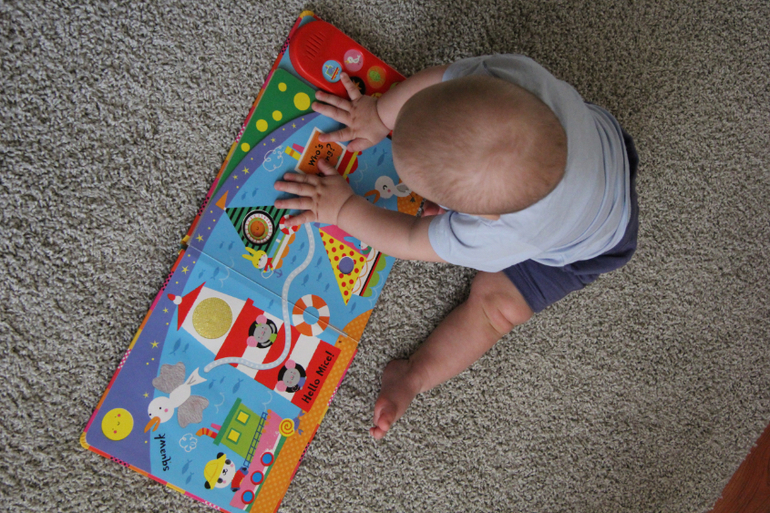 Читать активно начали где-то с 5 месяцев. Книги выставила в доступность ребенка и с момента, как сын научился вставать (а стимулом как раз и послужила эта заветная полочка) и доставать их с полки, книги стали любимой и самой долгоиграемой игрушкой. Убрала выше только совсем тоненькие и с клапанами (уже после того, как пострадали). Сейчас (в год), ребенок очень активно приносит книжки в руки, листает сам.