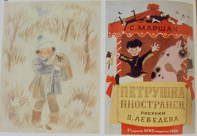 Пример 1. Работа известного иллюстратора и основоположника советской детской книги Владимира Лебедева. В 1924 году он возглавил художественную редакцию только что созданного детского отдела Госиздата, внёс огромный вклад в разработку художественной конструкции детской книги, в композиционные и изобразительные приёмы и средства, и поддержал совершенно новое отношение к самому содержанию детской книги. Вот как вспоминал о нем художник Орест Верейский (иллюстратор Твардовского, Шолохова, Паустовского, Фадеева, Пришвина и других): Можно восторгаться одними произведениями Лебедева, другие могут нравиться меньше, но никогда нельзя заподозрить художника в равнодушии, в чисто "служебном" отношении к изображаемому. Он был очень строгим художественным редактором, требовал точности знания каждого изображаемого предмета, анатомии человека и животных. Особенно придирчив он был к любому изображению лошади. Здесь угодить ему было почти невозможно. Зато не было большей награды, чем заслужить его похвалу. Мне приходилось видеть, как он на краю бумаги, покрывающей стол, беглым карандашным штрихом показывал, как сгибается на ходу лошадиная нога или как выглядит круп вздыбленного коня.