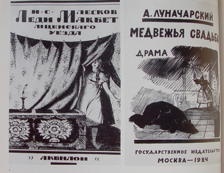 (здесь вверху Н.Пискарев илл.к «Анне Карениной», 1932г., слева М.Пиков илл.к «Сочинениям» Аньоло Фиренцуолы, 1933 г., справа В.Бехтерев илл.к «Жану Сбогару» Ш.Нодье, 1934 г.)