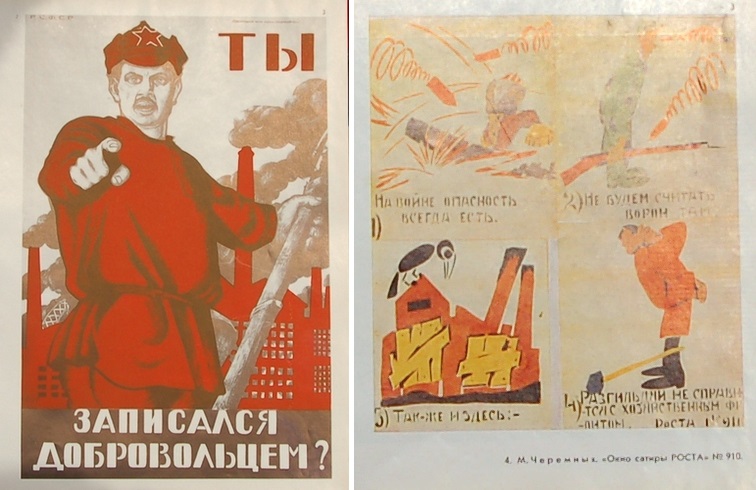 Печатные плакаты были живым откликом на бурные события жизни. Но ее стремительные темпы, а также разбуженные революцией ранее неграмотные слои населения требовали еще более конкретных и оперативных форм наглядной агитации. Такой формой оказались рисуемые и размножаемые от руки листы, которые выставлялись в витринах Российского телеграфного агентства (РОСТА), а порой трафаретились прямо на заборах, мостовых и стенах домов.