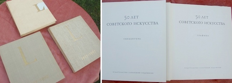 Эти огромные каталоги с интригующей буквой «Л» на тканевой обложке - история живописи, графики и скульптуры за 50 лет, с 1917 по 1967 годы. В одном из них изложена история графики, почему возникали те или иные направления, в чем это выражалось, и другие интересные моменты с огромным количеством графического материала. К примеру, я даже не думала, что в тридцатые годы взрослые книги издавались с иллюстрациями, а они были - к Лермонтову, к Достоевскому, к зарубежным писателям... Не говоря уже о детских книгах.