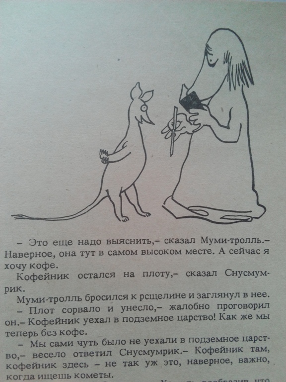 Мне самой книга очень понравилась! И всем вышеперечисленным, и наверное какими-то философскими вещами. Ну вот, например, есть там герой Снуснумрик - он путешествует в одиночестве, играет грустные песни на губной гармошке и считает, что нельзя окружать себя вещами, ценность жизни не в них. Сам ходит в одних и тех же штанах с рождения. Или взять образ Муми-мамы. В момент казалось бы полного отчаянья, когда стало понятно, что комета упадет на землю через несколько дней, Муми-тролль решает одно: над вернуться домой к маме, она что-нибудь придумает. Вот она вера ребенка в безграничные возможности мамы! А когда в Муми-дом приходят непрошенные гости, гостеприимная Муми-мама первым делом просит мужа принести дополнительные чашки для чая. А уж потом выясняет, зачем пожаловали.