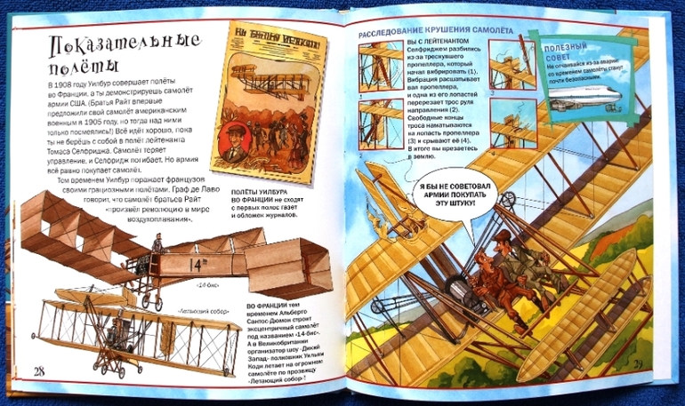 дошкольникамСын уже неделю ее изучает. Книга очень грамотно создана: яркие мультяшные иллюстрации, текст разбит на блоки и его мало, детские «фишечки» - кусочки комиксов, врезки с полезными советами и тд. А главная «фишка» - книга разговаривает с ребенком, она ставит его на место изобретателя, со страниц звучит: «Тебя зовут Орвилл Райт.» У моего ребенка от этого кажется крылья расправляются.