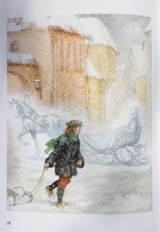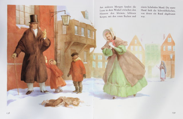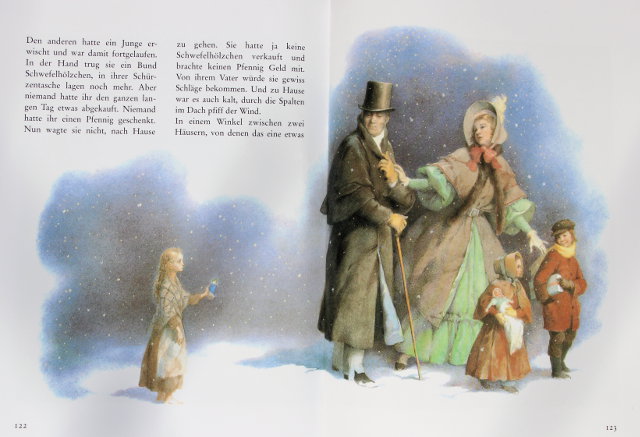 Иллюстраций очень много, они на каждом развороте, иногда даже и несколько. Смотрите, какая хорошая идея в "Девочке со спичками". Одна и та же семья видит девочку в начале и конце. Обратите внимание на количество страниц - иллюстраций море!