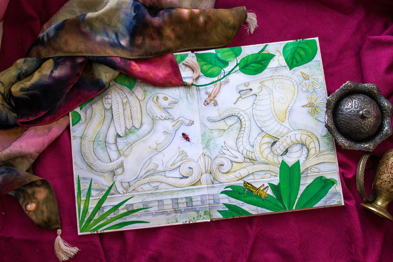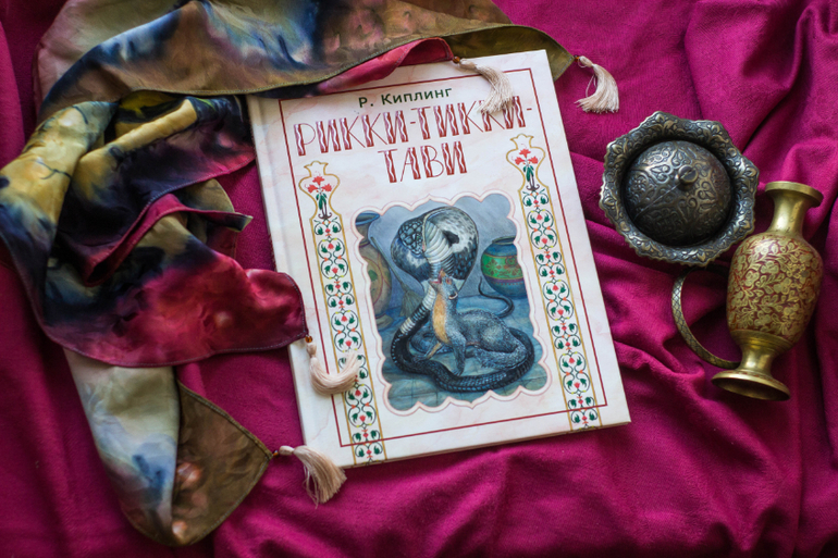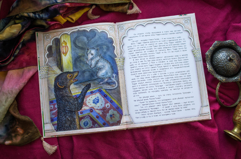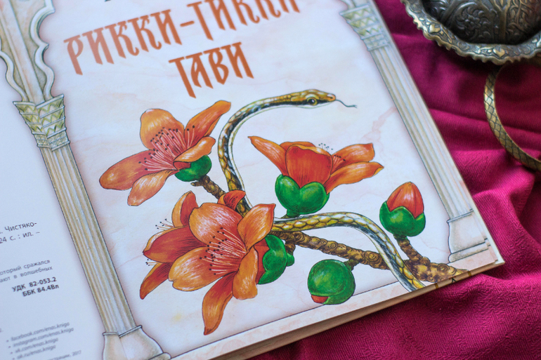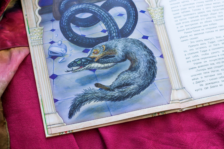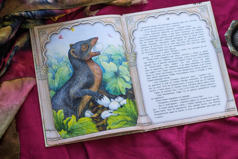 История о смелом мангусте, который сражался с кобрами Нагом и Нагайной, знакомая нам из детства. Хотя я лично плохо ее помню, кажется, мы смотрели мульфильм, а вот книги не было. Сразу буду показывать, потому что такую красоту прятать нельзя.