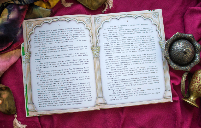 Бумага довольно плотная небликующая меловка, цвета на ней яркие и насыщенные. Перевод полный, без упрощений, но очень легко читается. А описание мангустов такое, что мы почти передумали заводить собаку и подумываем о мангусте)) У Вари (ей 4,5 г) пока есть трудности в восприятии слишком большого объема текста, но эту книгу, если расставлять акценты, слушает очень внимательно, мы с ней пока дочитали до середины, но поделиться мне уж очень хочется. Потому что эту книгу даже держать в руках одно удовольствие. Как восточное украшение на нашей книжной полке!
