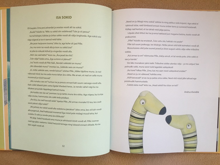 Я успела лишь пролистать книгу и прочитать пару сказок и стишков. Один из рассказов повествует о найденных под диваном носках, которые обнимали яйцо. Когда кто-то пытался достать это самое яйцо, носки кусались, а в итоге из яичка вылупились маленькие колготки:) вот такой полет фантазии.