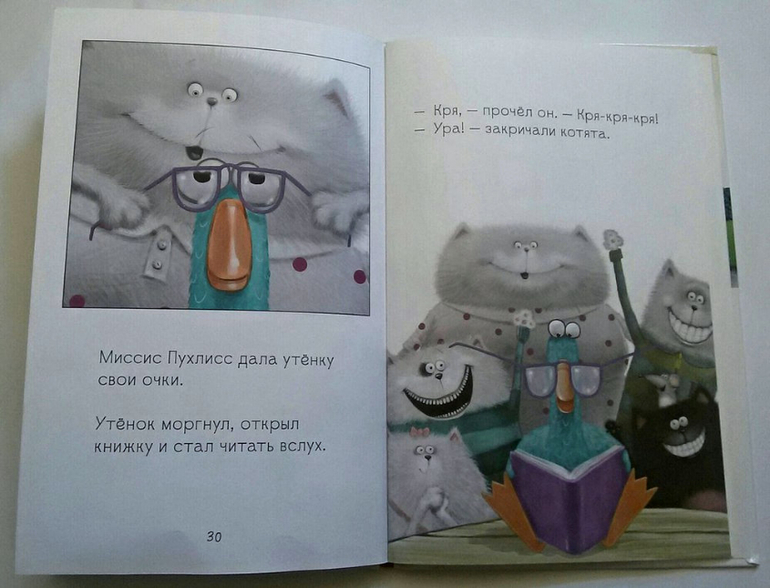 Котенка Шмяка я всегда игнорировала и как оказалось очень незаслуженно. Не зря пишут сколько хороших отзывов про эти книги. Детям они действительно нравятся. Мы прочитали пока только одну "Котенок Шмяк и утенок, который не крякал", но останавливаться на этом не собираемся. В книге небольшое количество текста, знакомые слова и несложные предложения. А главное -интересный и понятный ребенку сюжет. По дороге в школу Шмяк столкнулся нос к клюву с забавным утенком. Причем в этом бирюзовом существе даже двухлетний ребенок безошибочно определил утенка (кря-кря). Шмяку показалось странным, что утенок молчит и не крякает. Вместе с друзьями он пытался его рассмешить, переодеть и накормить, но тот продолжал молчать. Как хорошо, что есть замечательная миссис Пухлис, которая всегда поможет. Оказалось, что у утенка плохое зрение и ему нужны очки. А молчал он, видимо, от жуткого дискомфорта и неуверенности. )) Вот такая история!