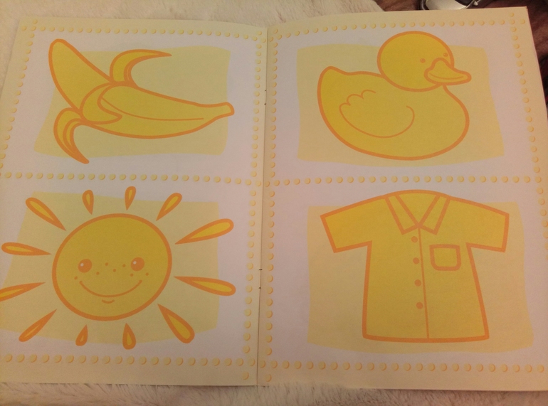 Они небольшого формата, представлены 10 цветов, почти как в большой Учим цвета, нет только белого. Каждая страничка один цвет, есть пятнышко краски этого цвета, какой нибудь пример этого цвета и свободное место куда можно лепить как душе угодно)