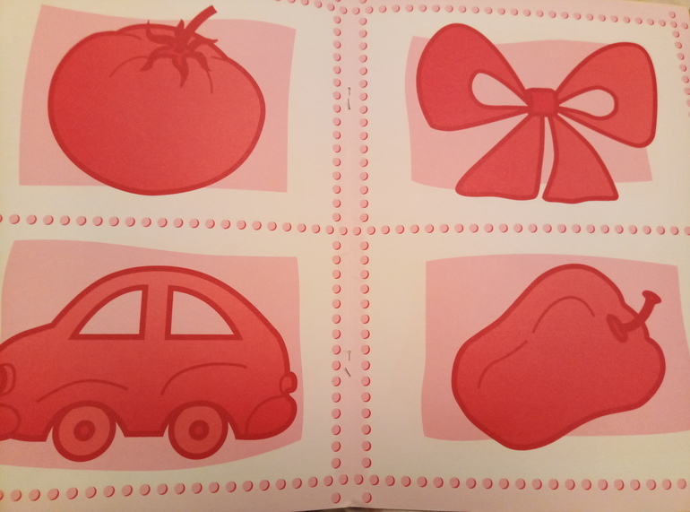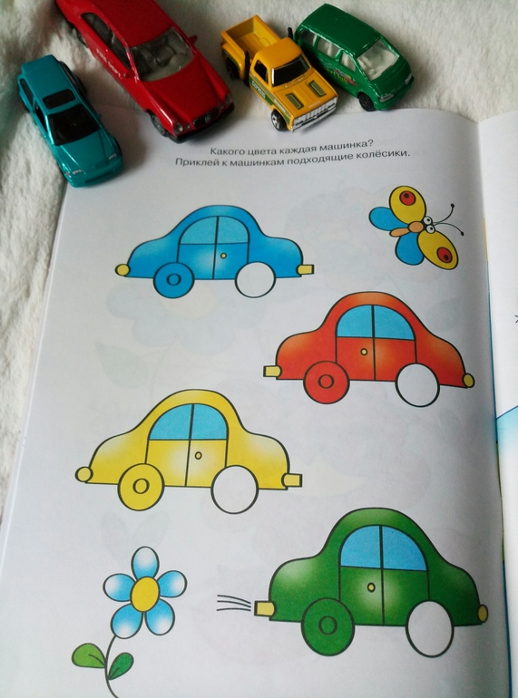 Колеса пока не клеим, я не сторонница делать все за ребенка, хочу, чтоб сам дорос и понял. А вот машинки такие же по цвету с удовольствием подбираем. Помимо цветов, там еще есть задания и на форму. Задания начинаются с самых простых, а потом усложняются, добавляются понятия больше меньше, узкий широкий