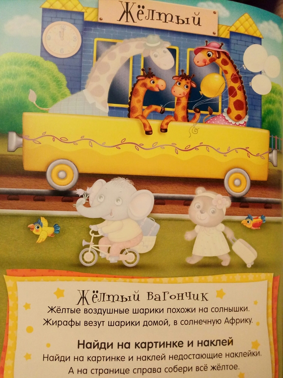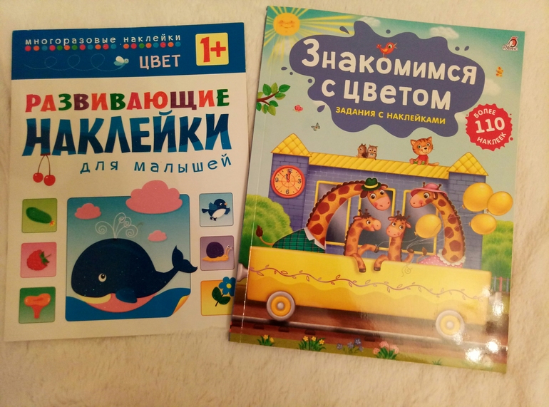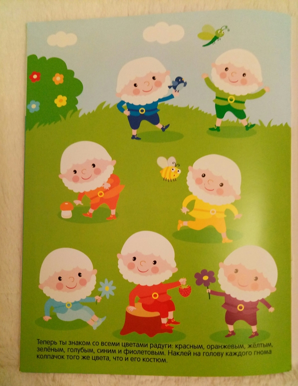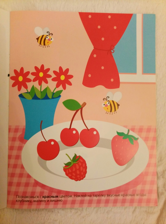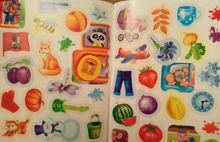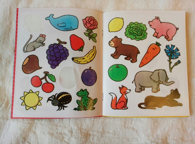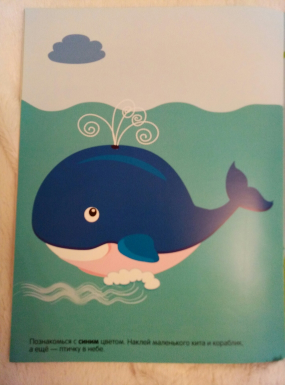 Развивающие наклейки от Мозаики, просто отличная серия!На данный момент эти наклейки самые любимые у сына, потому что они многоразовые, и можно клеить и переклеивать сколько душе угодно) и на обложке замечательные блестящие рисунки, особенно нравится китенок) Возраст указан с года. Представлены все 7 цветов радуги. Рисунки и наклейки очень яркие, насыщенные и крупные. Наклеек, правда, не много, всего по три-четыре на каждый цвет. Темы в основном радостные летние, ягодки, цветочки, море, грядки с огурчиками, ох, скорей бы уже лето!) А еще с этими наклейками можно похулиганить, наклеить их неправильно, и пусть малышок исправляет, что мама напутала)