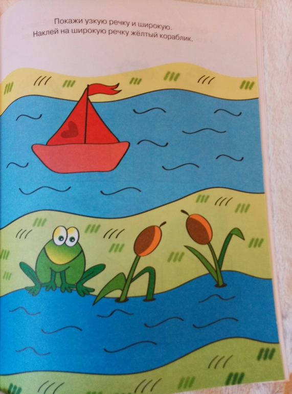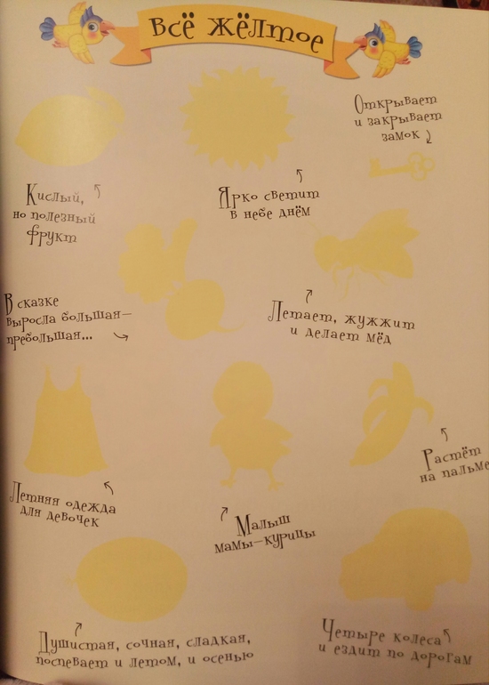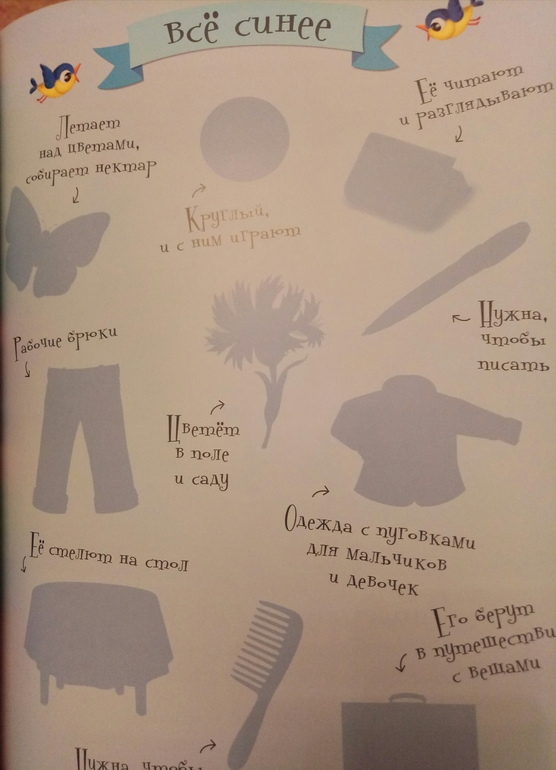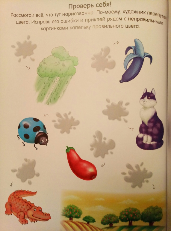 На одном стороне разворота наклейки нужно клеить четко на тень, а не в свободном полете, как в предыдущих пособиях, а нам до такой аккуратности далеко. А с другой стороны разворота по описанию и тени нужно отгадать предмет, и если кто мяукает и ловит мышей мы быстро отгадаем, то летняя одежда для девочки еще нам не известна) еще есть задание, какие цвета перепутал художник, интересное, но тоже на постарше.