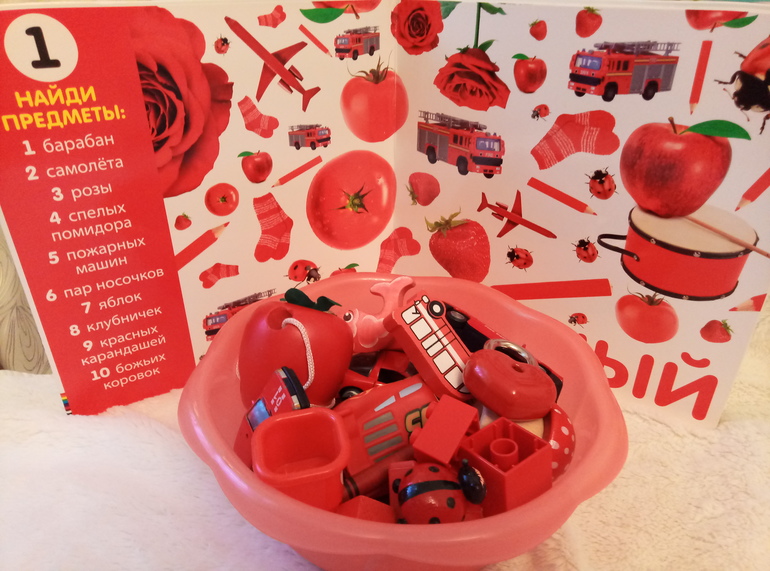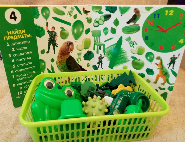Мы перебираем игрушки, что то находим на картинках, главное, при этом постоянно повторять название цвета) Так что временно мы убираем игрушки не по категориям машинки, конструкторы, пирамидки, а по цветам в коробочки))