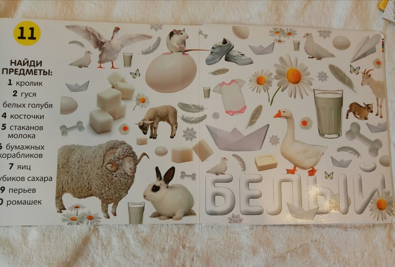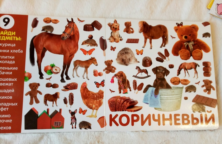 Самая главная, самая важная, самая яркая и самая любимая это,конечно же, Учим цвета и числа издательства Клевер!Я уже один раз пела ей дифирамбы и еще тогда сказала, что у книги будет несколько жизней, ну так вот у нас наступила вторая) Первая любовь к ней у нас началась месяцев в 8, когда сын только начал сидеть. Он подолгу мог рассматривать яркие, реалистичные картинки, находить знакомые предметы. Сама книжка очень качественная и приятная, такой квадратный пухлик. Я всегда знала, что если оставляю дочь с мелким и этой книгой, мин 15 времени мне обеспечено. Мы ее таскали очень усиленно, но она у нас до сих пор в приличном виде, только на всякий случай проклеили середину скотчем. Потом она лежала некоторое время невостребованная, а вот, поняв что надо серьезно заниматься цветами, мы ее достали опять. Ну и конечно, нашу любимку ждет еще и третья жизнь, числа же мы тоже скоро будем учить)