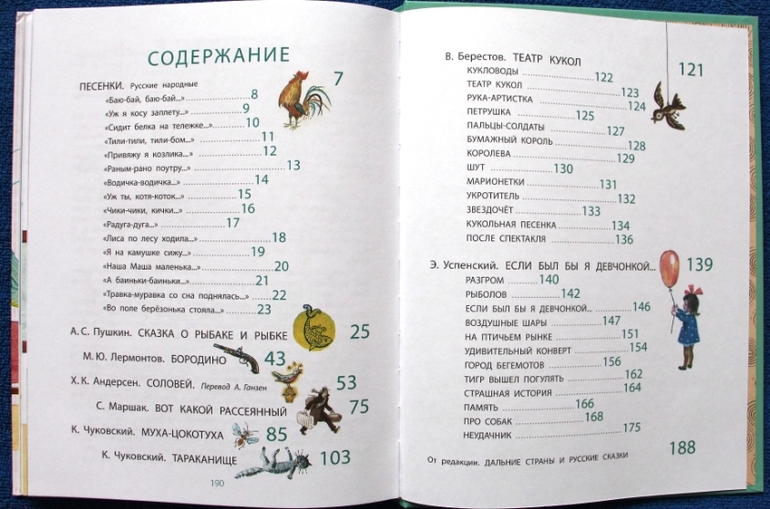 Еще в книге есть Пушкин, Лермонтов, Андерсен, Маршак, Чуковский, Берестов и Успенский. Причем здесь Успенского напечатаны стихи - признаюсь, не знала, что он стихи писал.
