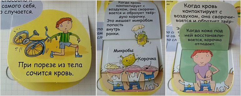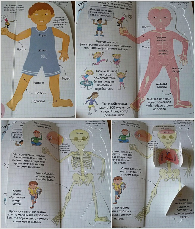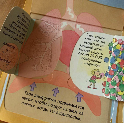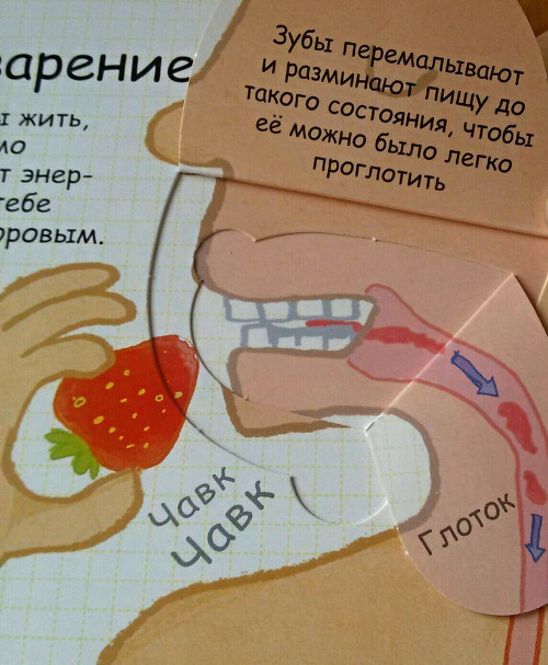 В нашем доме уже давно живет и пользуется большой популярностью энциклопедия от Робинс "Секреты человека" с окошками. Это была наша первая книга про человеческое тело. Наверное, для многих поиск книг по данной теме - дело сложное. И я не исключение. Все, что очень хотелось, уже закончилось в продаже. И наконец-то, в одном из отзывов я наткнулась на эту книгу. Я ни разу не пожалела, что ее купила. Мою тогда четырехлетку она увлекла очень надолго. Разворот про пищеварение мы знаем наизусть. Почему-то именно он больше всего интересовал дочку. Также в энциклопедии содержится информация о костях и мышцах, мозге, чувствах, развитии и здоровье. Приведено множество интересных фактов: