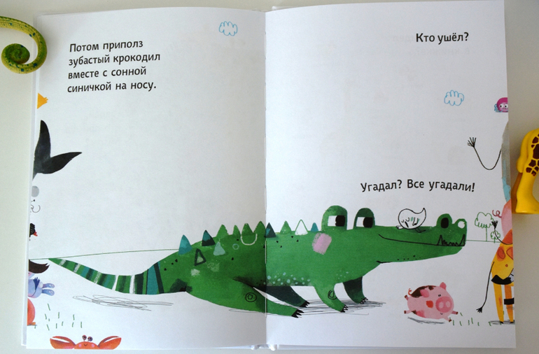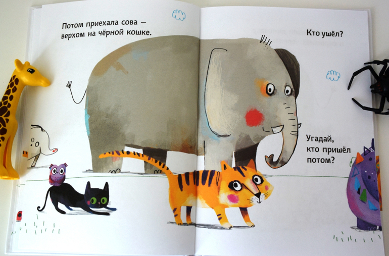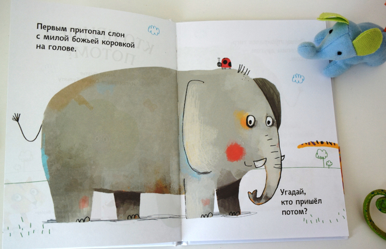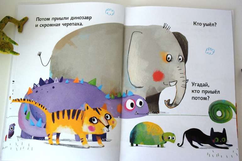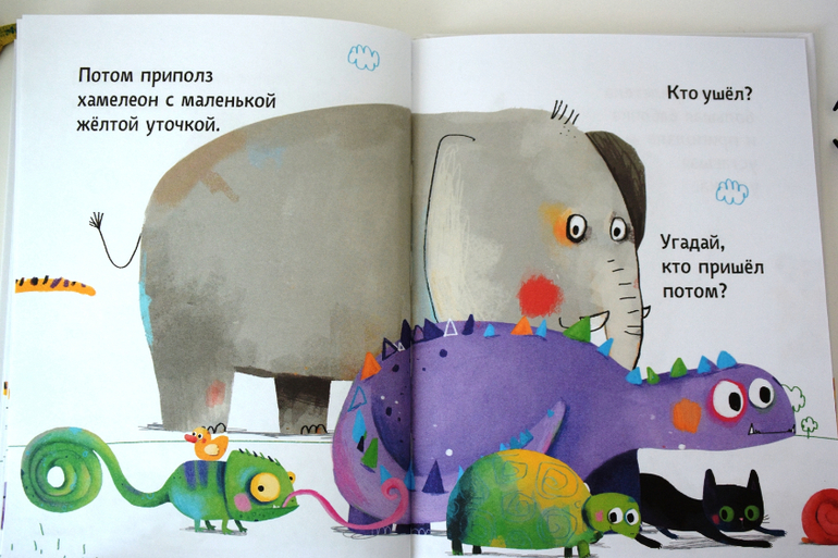 Если вашему ребенку почти 3, то это еще не значит, что данную книжку-игрушку малыш перерос. У нас которое утро подряд дома смех и гадалки: кто пришел, а кто с разворота ушел. Первый день дочка сомневалась и не совсем понимала куда смотреть. Ушел/пришел - все справа ищет:)). А потом обосновалась, с тюленем, туканом, хамелеоном на последней странице познакомилась и дело пошло. Хитрюга смотрит на меня и после моих "Угадай, кто пришел потом", деловито думает и отвечает: "ой, даже и не знааааю... давай, посмотрим?":))