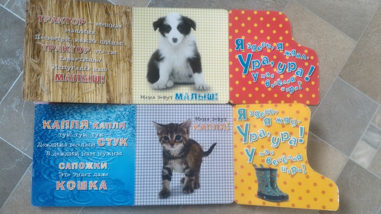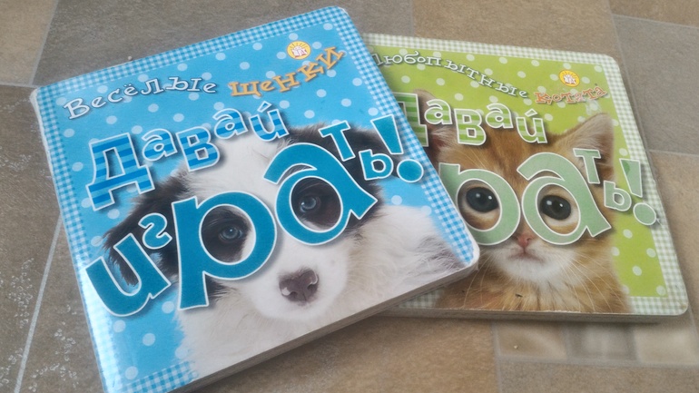 Читали лабиринтовские картонки про котят и шенят. Уже довольно спокойно к ним относится, а раньше пищала от восторга.