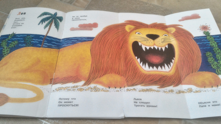 Читали Б.Заходера "Что снится моржу". Прекрасная книга, уже много раз в сообществе о ней писали, присоединяюсь ко всем восторженным отзывам. Самый любимый у Миры разворот - со львом
