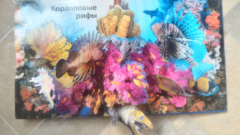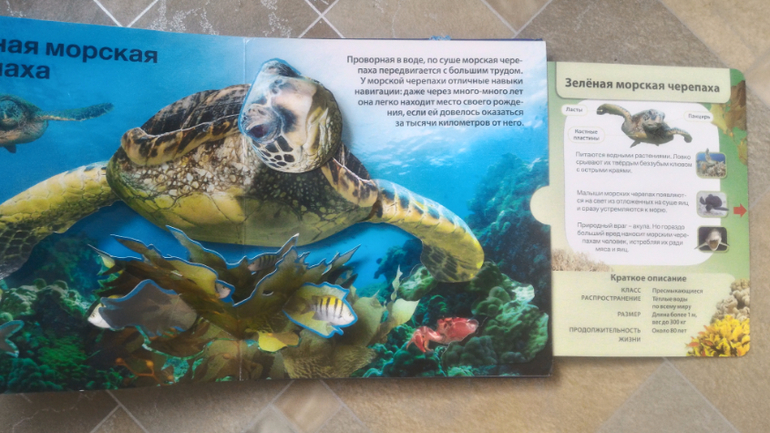 Любит очень "Живую книгу океана" от Азбукварика. Мне тоже нравится. Книга-панорамка, когда открываешь страничку, раздается характерный для какого-то морского обитателя звук или просто плеск волн. С интересом узнала, как разговаривают косатки и пингвины. Также сбоку выдвигается страничка с информацией о животном (его длина, что ест, где обитает). Эта книга обеспечивает мне 5 минут покоя, Мира смотрит её сама.