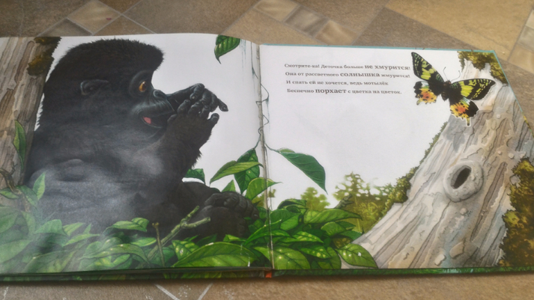 Следующую книгу я горячо рекомендую мамам всех маленьких деток - от рождения и лет до 3-3,5. "Кто разбудил детку" мы читаем с обоими детьми уже полгода и никому она не надоела. Купила её, прочитав восторженный отзыв здесь, в ДК, и ни капли не пожалела. Она великолепная - яркие, красочные иллюстрации, интересное стихотворение, действие нарастает, как снежный ком: вот на ветке проснулась и захныкала маленькая горилла, оказалось, что ее разбудил бегемот, которого переполошила зебра, которую испугал свои рыком лев, которого разбудил крокодил, которого потревожил лягушонок, которого своим жалом перепугала пчела. А виновником всего переполоха оказался...мотылек. Такая вот весёлая история в стихах в духе "Дома, который построил Джек"