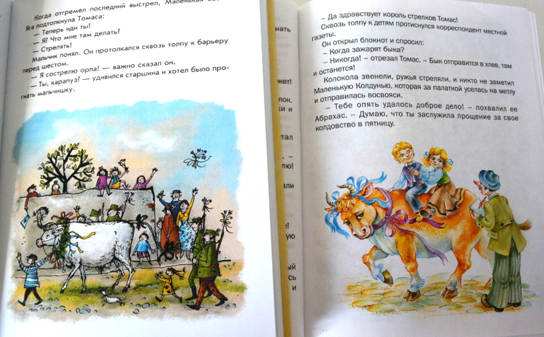 Пошли в магазин за новой метлой. Здесь особенно хочется заметить правильность рисунков к маленькой Бабе-яге:). Продавец по тексту увидел обычную старушку. У Ковалевой (Русич) маленькая Колдунья нарисована девочкой.