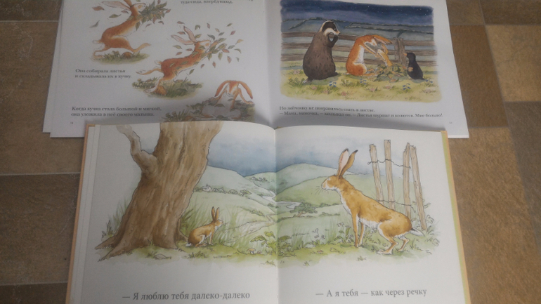 Заячья тема: "Куда уложить зайчонка" от "М-П" и "Знаешь, как я тебя люблю" от "РЖ". Первая мне нравится больше, там тема любви родителя к ребенка раскрыта гораздо ярче и полнее - мама готова всю ночь не спать, оберегая сон своего малыша. Во второй книге они лишь дурачатся, выдумывая, кто кого любит сильнее. Художник у книг разный, а иллюстрации очень похожи