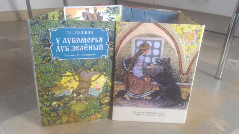 Расскажу о последних наших любимчиках, начнём с верху стопки. Там расположилось стихотворение А.С. Пушкина "У Лукоморья". У нас оно в раскладушке от "Нигмы" с великолепными иллюстрациями Кочергина. Вова очень любит эту книгу, читаем сразу по несколько раз