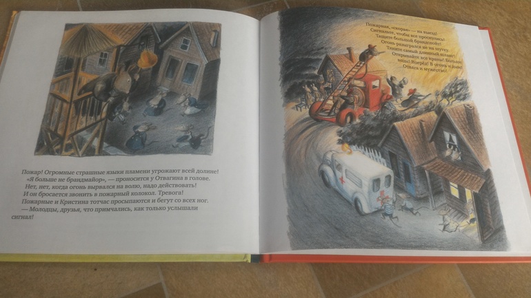 Следующую книгу купила на волне увлечения темой пожарных, огнеборцев и всего такого. У. Нильсон "День с мышиной пожарной командой" в принципе, книга неплохая, много действия, постоянно герои куда-то мчатся, кого-то спасают, дорогу домой показывают, голодных крысят кормят, самооценку лягушонку поднимают и т.д. В финале наконец-то исполняют свои непосредственные обязанности - тушат пожар. Еще есть в книге вредный богатый господин, который в целях экономии хочет прикрыть пожарную часть, но в итоге все понимают, что спасатели в мышиной долине необходимы и всё остается как есть. Иллюстрации очень нежные, но хотелось бы чуточку поярче их сделать. И текст местами хромает, немного корявый, но в целом всё хорошо. Вове нравится, периодически приносит.