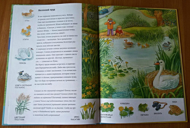Очень многие моменты являются схожими и универсальными в жизни разных стран: изменения в природе, повадки животных. Разница в жизни людей. Но в этой книге она совсем незначительная. Мы также сажаем цветы, едим мороженое в кафе, красим яйца и гуляем на детских площадках.