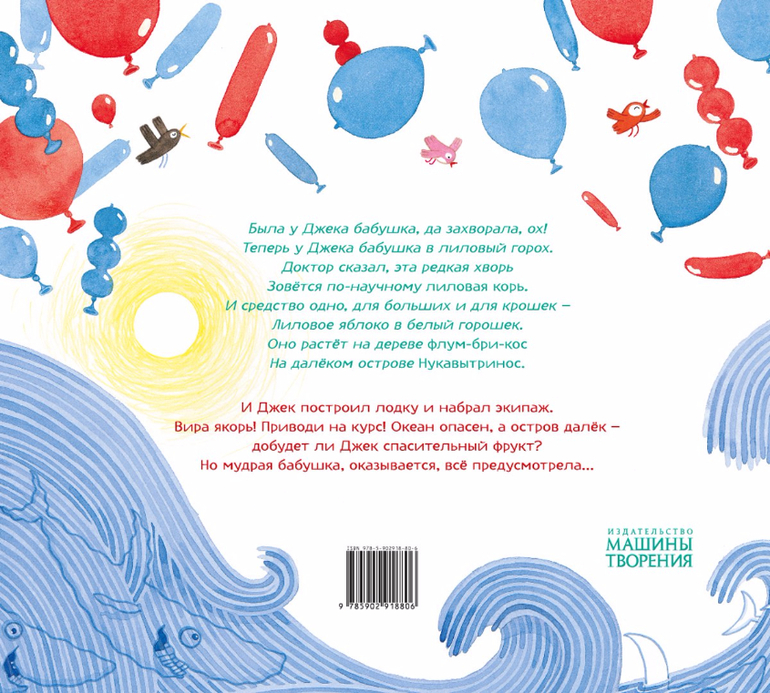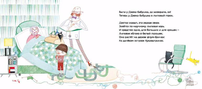Была у Джека бабушка, да захворала, ох! / Теперь у Джека бабушка в лиловый горох. / Доктор сказал, эта редкая хворь / Зовётся по-научному лиловая корь. / И средство одно, для больших и для крошек - / Лиловое яблоко в белый горошек. / Оно растёт на дереве флум-бри-кос / На далёком острове Нукавытринос.