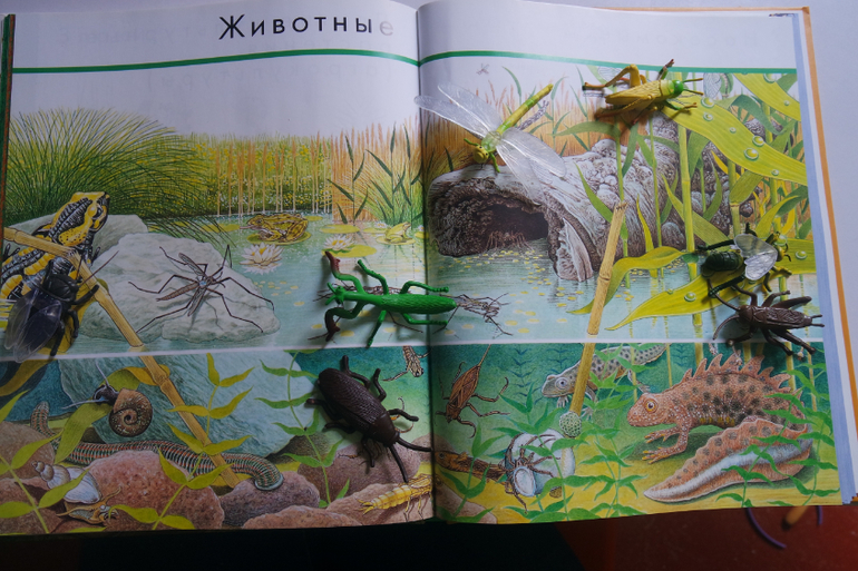 У книги есть огромный плюс. Изображения насекомых совпадают по размеру с нашим набором игрушечных насекомых.