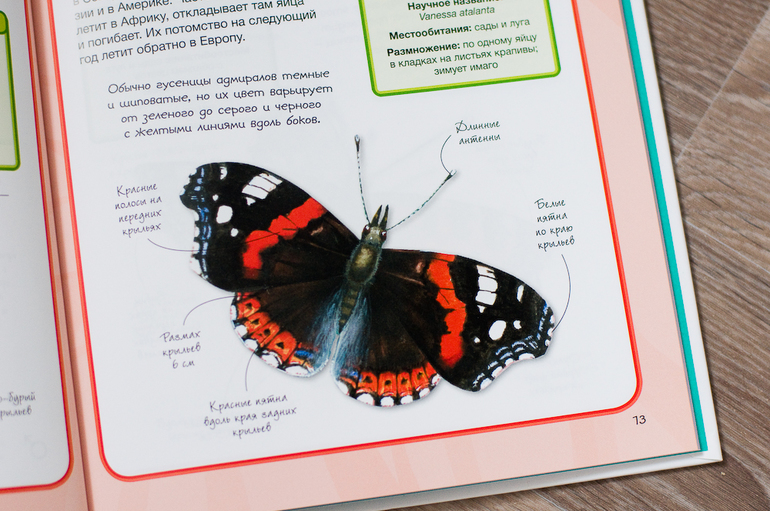 Особенно я удивилась, что оказывается обычные солдатики (букашки такие красненькие) - это клопы! Вот вы знали? Я нет. А еще много-много других насекомых и обо всех по чуть-чуть написано, даже есть картинка в натуральную величину, так что можно реально представить, какая бабочка махаон большая, а какая белокрылка маленькая, прям с игольное ушко.