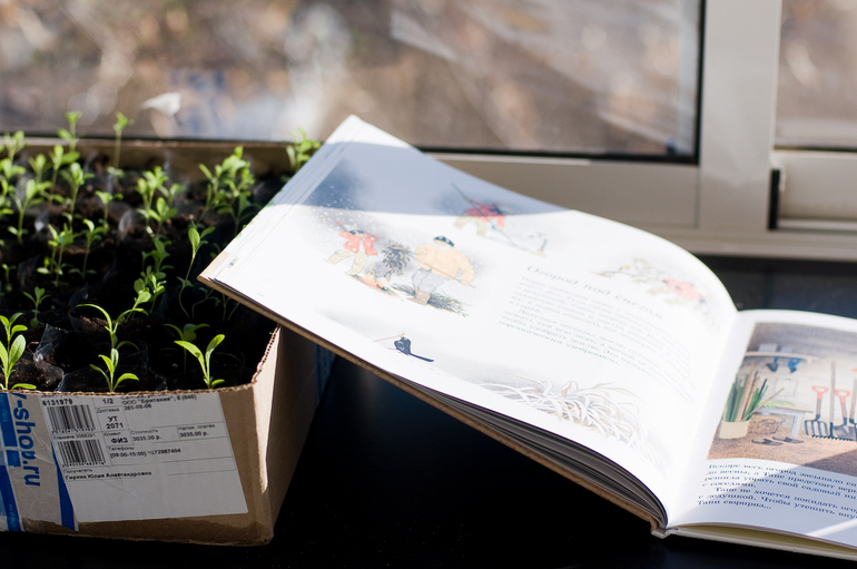 Но и Семке достается своей весны. Тут и посев семян на рассаду, а скоро и в грядки. Совсем как Алеша в книге помогает мне, рассовывает пальчиками по стаканчикам с землей маленькие зернышки - будущие огурчики-тыковки)