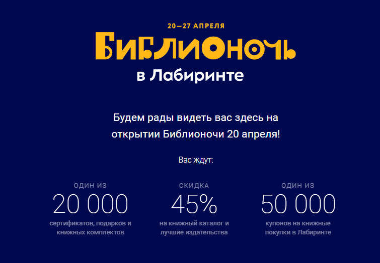 Дорогие друзья, «Библионочь» - главное событие в жизни читающего человека, а еще - всероссийский праздник в поддержку чтения, в котором принимают участие библиотеки, музеи, культурные центры. Важная новость заключается в том, что в Лабиринте проходит настоящая Библионеделя. С 20 по 27 апреля вас ждут грандиозный розыгрыш и тысячи подарков: книжные сертификаты, сувениры, подарочные комплекты книг и другие ежедневные сюрпризы. И, конечно, самые большие скидки в году.