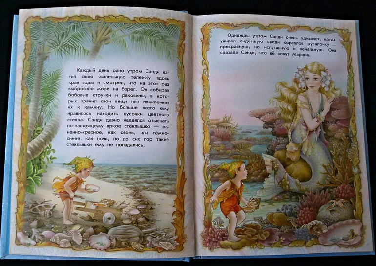 "Он храбро нырнул и стал спускаться сквозь темную воду, пока его ноги не коснулись дна. С каждой морской волной до Сэнди долетал тихий звон колокола, а вдали эльф начал смутно различать мерцающие огоньки. Сэнди подумал, что это, наверное, и есть подводный город, и зашагал на свет по песчаному дну".